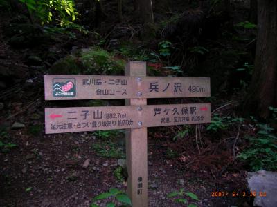 「岳ノ沢」と表示のある小さな沢との合流点。 芦ヶ久保駅まで約25分とあります。