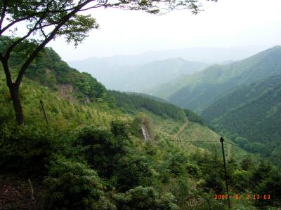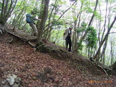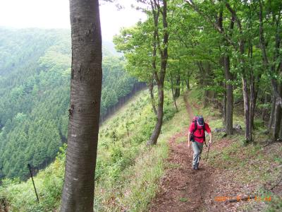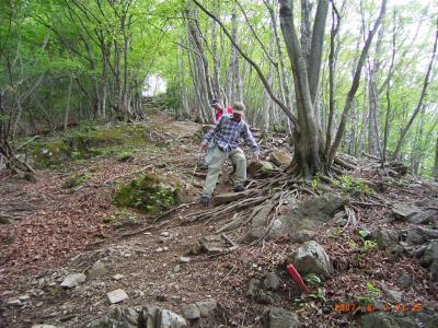 突然急坂下りになります。 ザレ気味で滑りやすいので立ち木に掴まりながら怖々下っています。