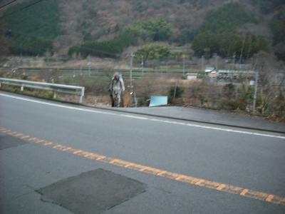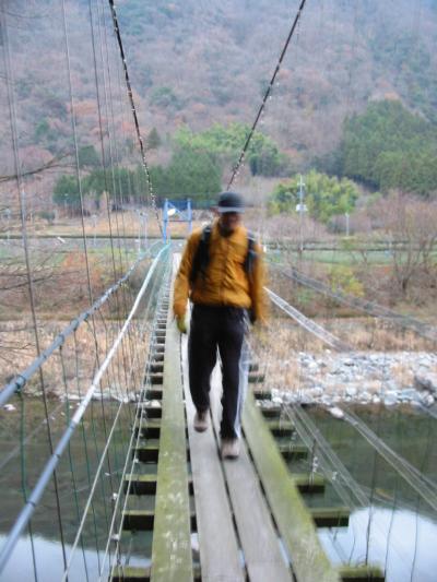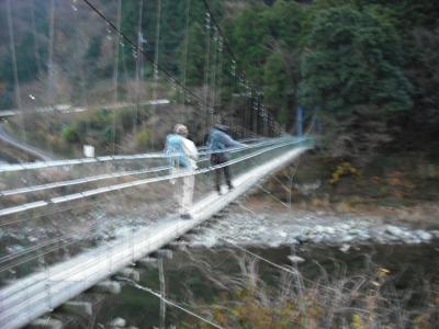 「そろそろ行きましょうか」と、吊橋を渡って向こう岸のバス停へ向かいます。 |